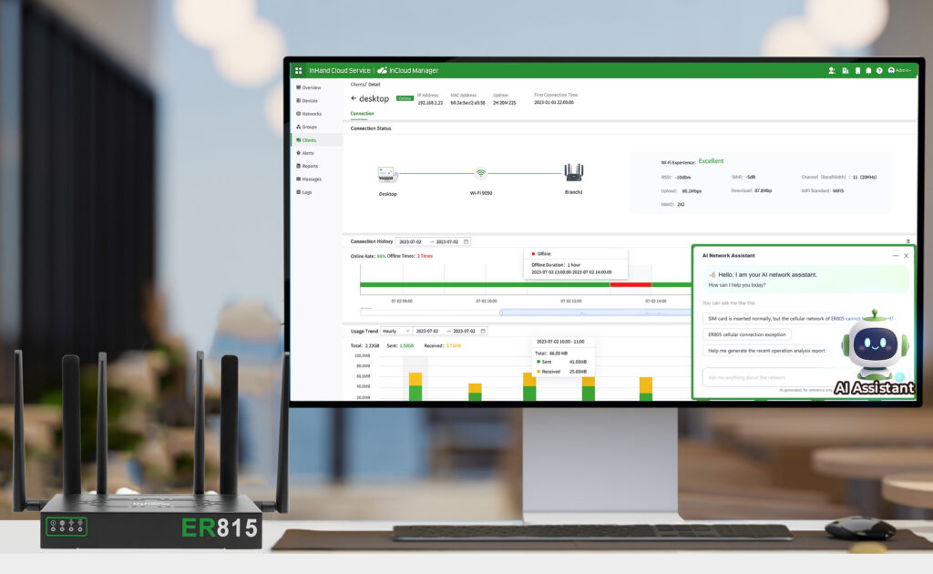 • AI 智能诊断 —— 主动发现,精准修复 通过深度分析设备日志、信号质量等多维数据,AI全面洞察网络状态,自动识别潜在隐患,精准定位问题并提供修复建议。推动网络运维从“被动响应”迈向“主动自愈”,持续保持最佳状态。