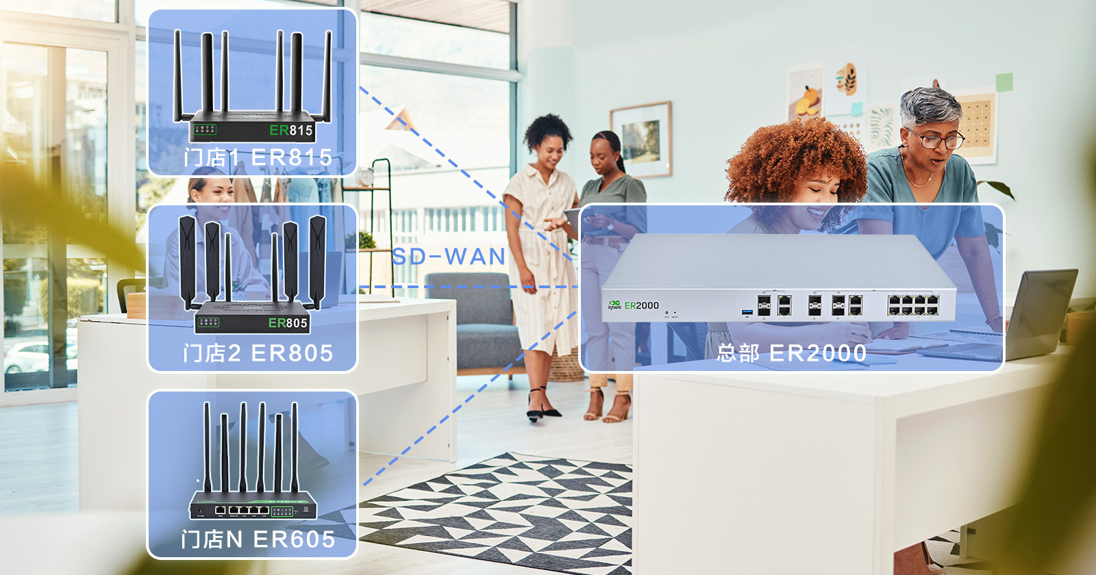 - 边缘路由器ER系列提供有线、蜂窝、无线混合线路汇聚,支持Hub-spoke、Partial-mesh组网模型,灵活组建分支机构间Overlay网络